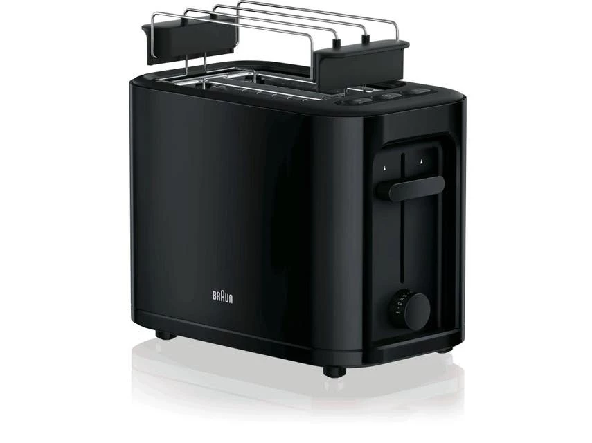 EINFACHE BEDIENUNG: Die Aufwärm-, Stop- und Auftauftasten sind von oben am Toaster zu bedienen. Die Röstgradeinstellung und Hebetaste sind an der Seite des Toasters positioniert