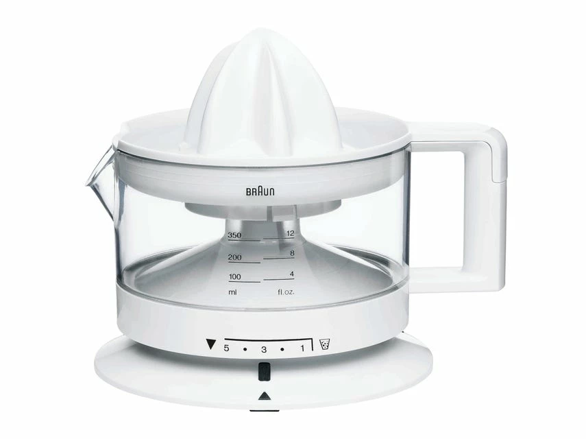 Mit der Zitruspresse „CJ 3000 WH“ von Braun machen Sie perfekte Fruchtsäfte. Der Fruchtfleischanteil kann eingestellt werden und die Presse ist ausgestattet mit einer Start- Stopp Automatik. Das Fassungsvermögen misst 350ml. Die einzelnen Teile könenn abgenommen werden und sind einfach zu Reinigen da sie auch für die Spülmaschine geeignet sind. Die Leistung beträgt 20 Watt.