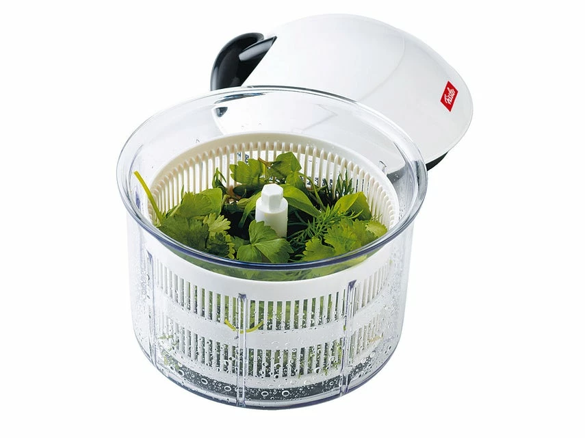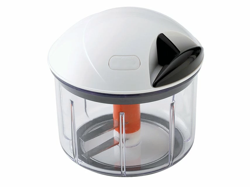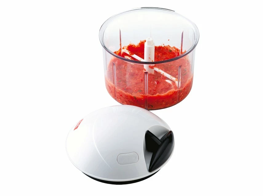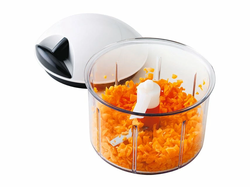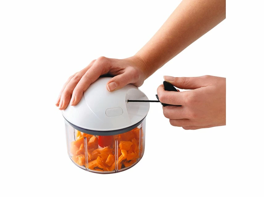 Ohne Mühe per Hand ziehen: Mit dem Multifunktions-Schneider werden Obst und Gemüse zerkleinert, Kräuter geschleudert, Suppen und Soßen gemixt und zerkleinerte Speisen frisch gehalten