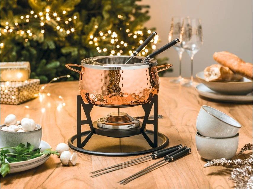 Mit diesem Fondueset aus verkupferten und gehämmerten Edelstahl könne bis zu 6 Leute herzhaft schlemmen. Der rustikale Stil bereitet zusätzlich Freude. Ob zu Silvester oder zu einer anderen Gelegenheit, das Slowfood mit Gemüse, Fleisch und Co schmeckt so ziemlich jeden.
