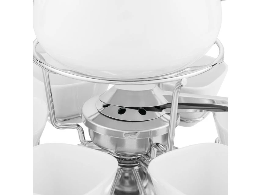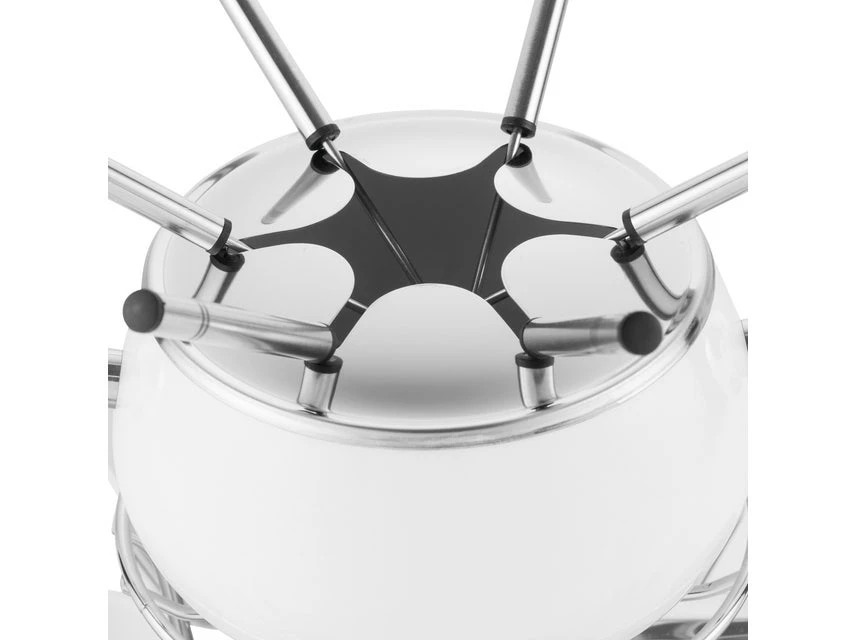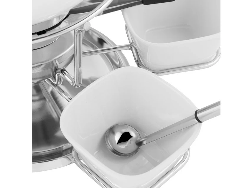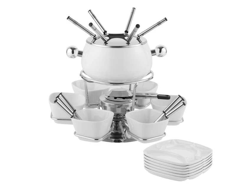 Wer liebt es nicht, das Fondue. Mit diesem 28teiligem Set haben Sie alles was Sie für einen perfekten Fondue-Abend brauchen. Der schöne Kessel steht auf einem eleganten Drahtgestell und wird von unten mit einem Brenner angeheizt. Der Topf ist mit einem Spritzschutz ausgestattet, welcher auch die Fonduegabeln praktisch an ihren Platz hält. Ein Highlight ist auch das Drehkarussell in welchem die kleinen Schälchen Platz finden und somit für jeden bequem zugänglich sind. Die Schöpflöffel im Miniformat sind für Saucen und Snacks unverzichtbar.