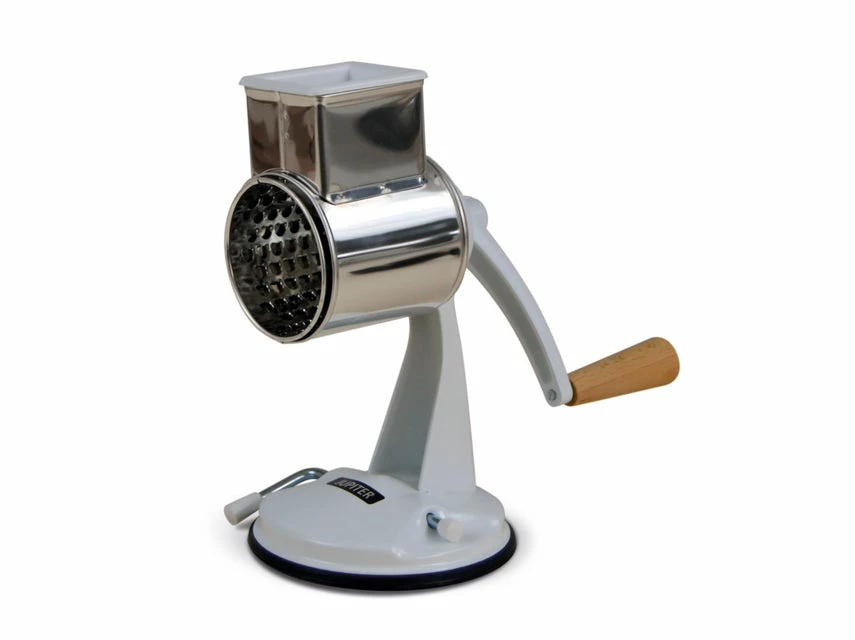 Die ideale Handreibe für Nüsse, Mandeln, Hartkäse und Blockschokolade. Großer Vakuum-Saugfuß sowie stabile Tischzwinge garantieren einen festen und sicheren Stand. Trommel 70 mm ظ. Ausgestattet mit Feinreibetrommel und Kartoffelreibetrommel. Mit stabiler Tischzwinge und großem Vakuum-Saugfuß garantiert sicherer Stand der Ganzmetall-Reibe auf allen glatten Flächen. Mit Kunststoff-Stopfer.