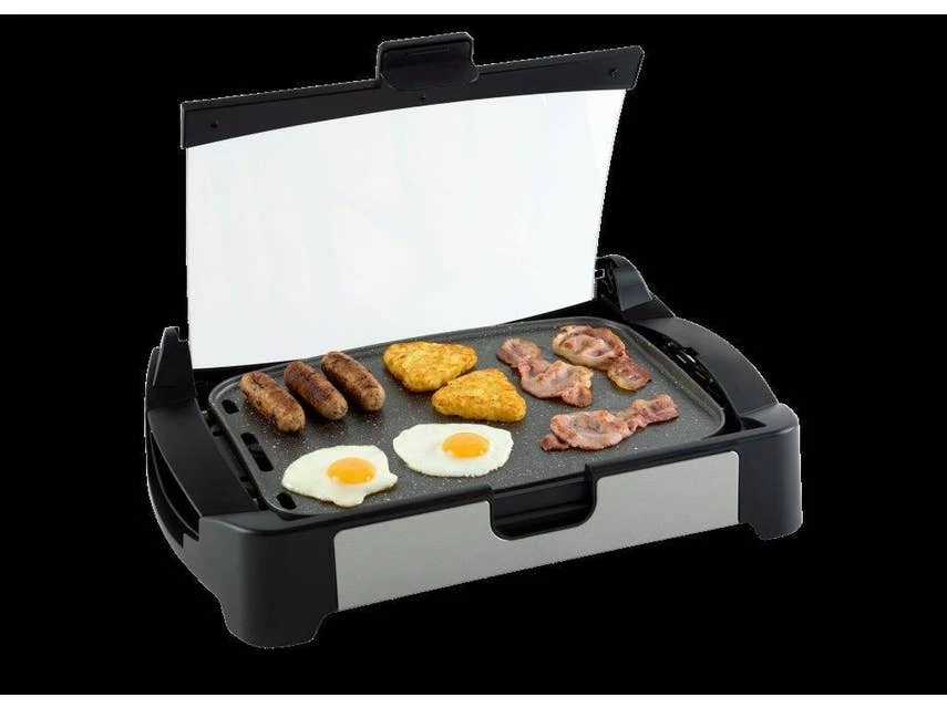 Das herausnehmbare Backblech hat zwei Seiten, sodass Sie wählen können, ob Sie auf dem glatten oder gerippten Backblech backen möchten. Dank des praktischen Spritzschutzdeckels kann der Tischgrill sowohl drinnen als auch draußen verwendet werden. An der Seite der Platte befindet sich ein Fettablassloch, so dass Ihr überschüssiges Fett in der unteren Auffangschale gesammelt wird. Das herausnehmbare Backblech und das Auffangblech können nach Gebrauch problemlos in der Spülmaschine gereinigt werden.