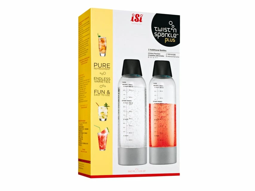 Seperate iSi Twist´n Sparkle Getränkesprudel-Flaschen welche wir im Set zu zwei Flaschen anbieten. Die Sprudelflaschen sind nur für Kaltanwendungen geeignet und dürfen nicht in die Geschirrspülmaschine.
