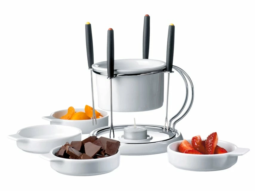 Dieses Schokoladen Fondue aus weißem Porzellan ist ein echtes Highlight. Es wirkt absolut edel und befriedigt stilbewusst jedes Leckermaul. Im Topf bringen Sie die Schokolade zart zum Schmelzen, und tauchen dann Ihre Obststückchen in den Schälchen serviert mit den Gabeln in den süßen Genuss. Das Set ist für 4 Personen gedacht und besteht aus: