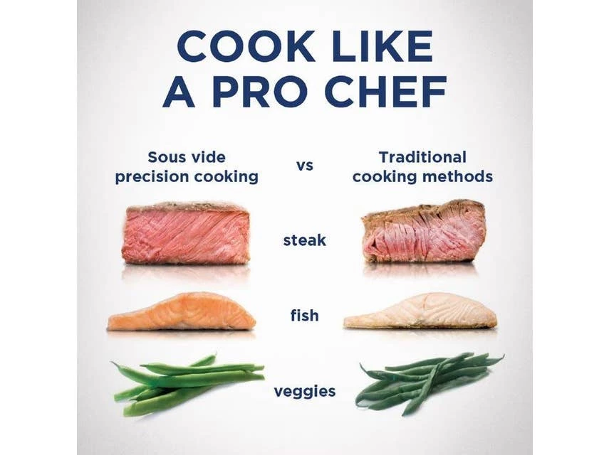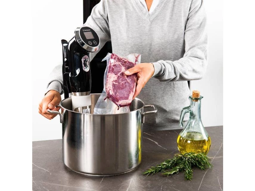 Edelstahl Sous Vide Garer der Marke Aicok. Auf dem Display werden die Zeit und die Temperatur angezeigt. Der Timer kann bis zu 99 Stunden und 59 Minuten eingestellt werden. Der Sous Vide Garer ist leicht zu reinigen und zaubert Ihnen Ihr Fleisch in bester Qualität herbei.
