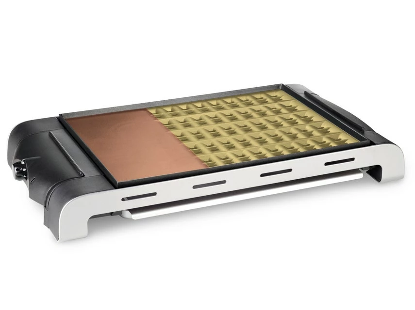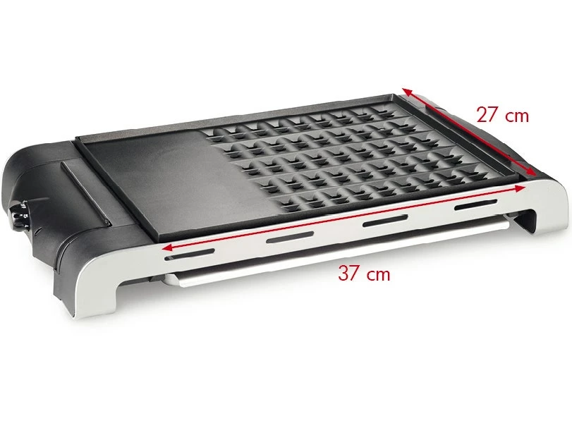 Große, antihaftbeschichtete Grillplatte (37x27cm) verhindert Festkleben von Grillgut.