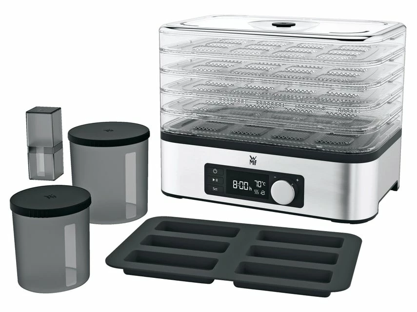 Der WMF KÜCHENminis Dörrautomat Snack to go vereint mit seinem hochwertigen Cromargan® Gehäuse edle Ästhetik, kompaktes Design und hohe Leistung. Mit diesem Powergerät lassen sich gedörrte, gesunde Snacks wie Trockenobst, Gemüsechips, Müsliriegel und vieles mehr für unterwegs, Schule oder Arbeit ganz einfach selbst zubereiten. Die Bedienung ist leise, sicher und benutzerfreundlich. Im Lieferumfang ist alles enthalten, um gleich loslegen zu können.